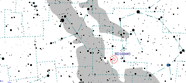 HD 168443 is in the dim constellation Serpents, located southeast of Aquila the Eagle.