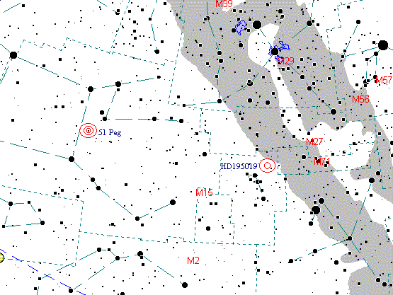 HD 195019 is located between the constellations Aquila and Cygnus in the small constellation Delphinus the Dolphin.Though not visible to the naked eye, the parent star of the first extrasolar system discovered, 51 Pegasi, is easily discernable in the Northern Sky.