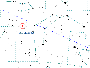 HD 222582 is a dim star in the constellation Aquarius. This planet has a mass 5.4 times that of Jupiter and orbits its star 35% farther than what the earth orbits the sun.
