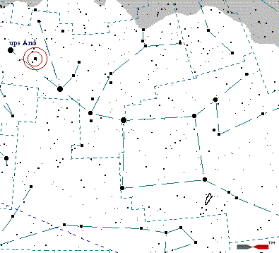 Upsilon Andromedae is located below the Great Square of Pegasus and between the V shaped asterism of 'The Princess'. This star is slightly dimmer than 51 Pegasi, which can also be seen be looking towards the heart of this mythical steed.